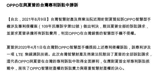 ▲ OPPO 在 2020 年也受 Sharp 在台灣與日本發動專利訴訟,不過當時法院裁定並未侵權