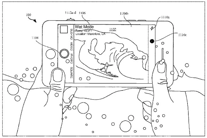 該公司在專利檔案中附上了一張插圖,展示了 iPhone 相機APP的「乾」、「濕」與「水下」模式設置。雖然功能有限,但在濕水模式下,相機界面會剔除某些 UI 元素,以提升互動體驗。而在水下模式,某些控件更是會被替換成更大的按鈕。