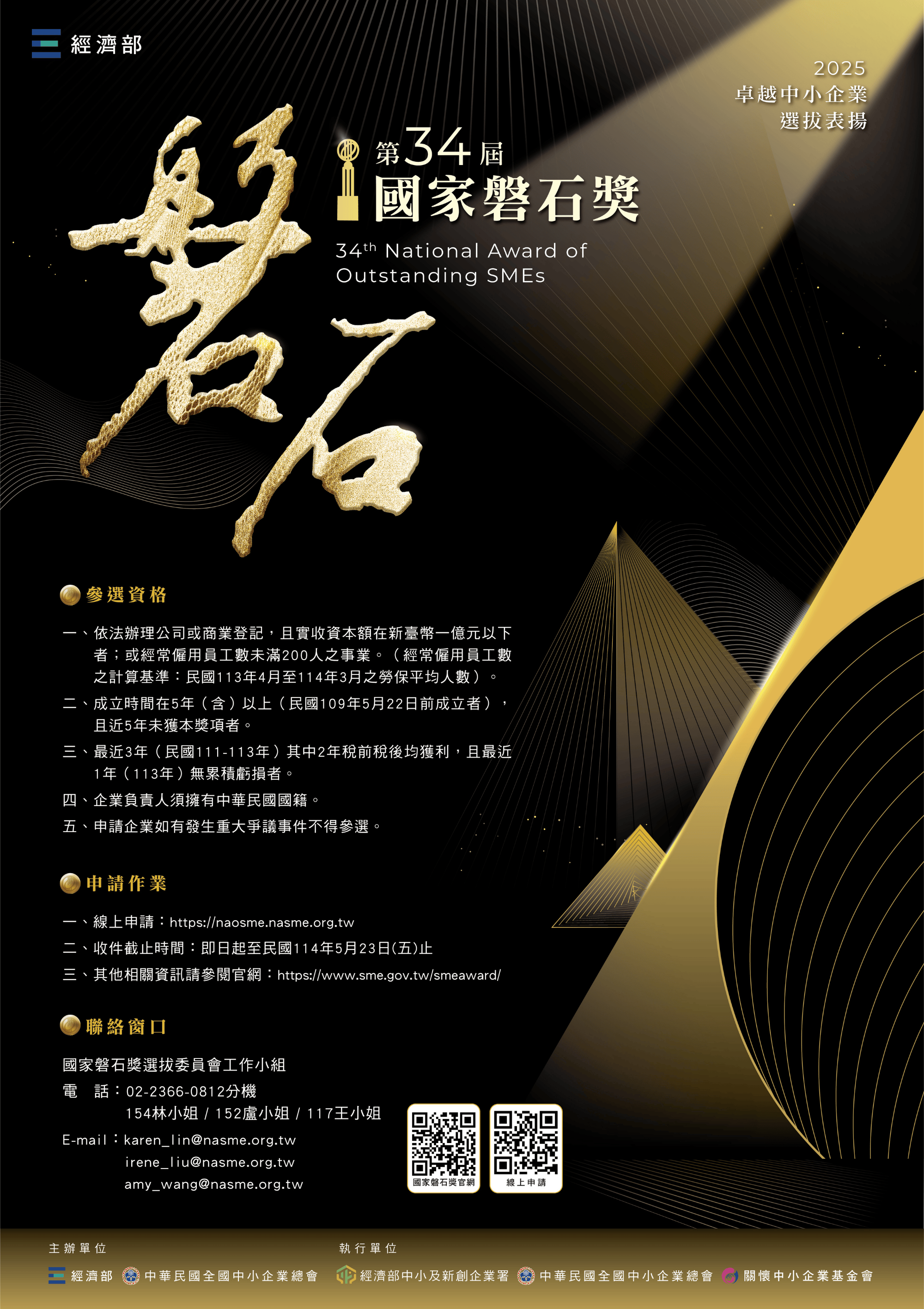 象徵中小企業最高榮譽的「國家磐石獎」,即日起至5月23日開放報名。榮獲此獎不僅代表經營實力的肯定,更是品牌價值躍升與永續發展的重要里程碑。
